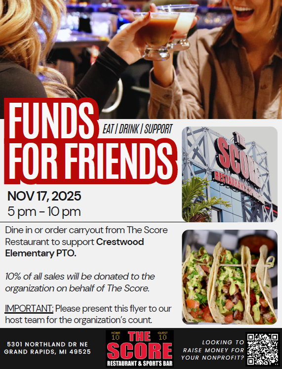 Join friends from Crestwood and dine at The Score on November 17th from 5PM-10PM - dine in or carry out! The Score will donate 10% back to Crestwood PTO to help fund classroom grants and programs. The Score has a game room for kids and trivia starts at 7PM. Please show the flyer image for Crestwood to get credit.