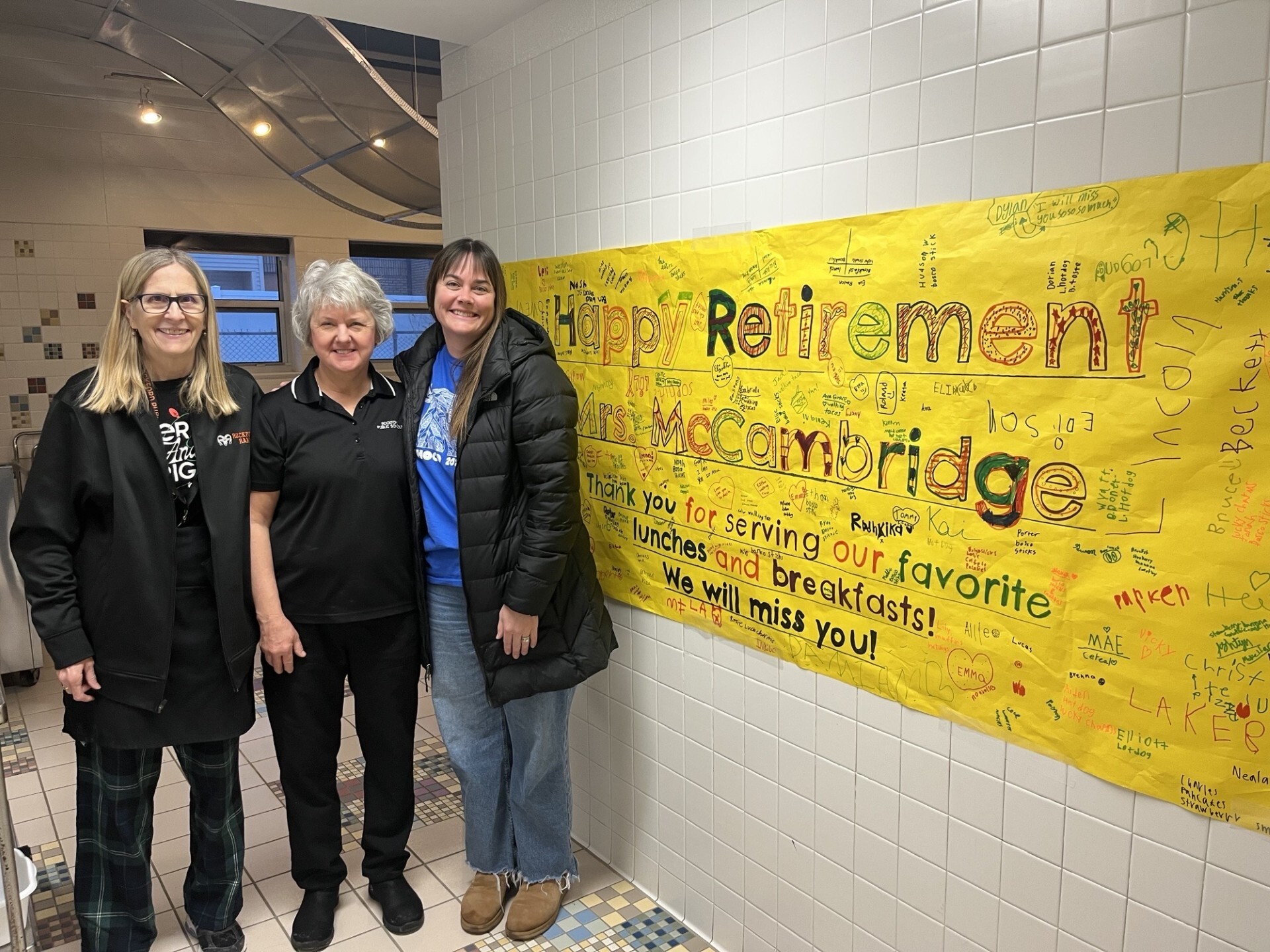 Mrs. McCambridge (center) will be retiring at the end of 2025! We will miss her at Belmont and appreciate all her efforts serving both breakfast and lunch to students at Belmont Elementary. The kids made a pretty special poster highlighting their favorite lunches! Chicken Poppers and Bosco Sticks seem to be crowd-favorites! Enjoy retirement, Mrs. McCambridge, and visit us when you can!