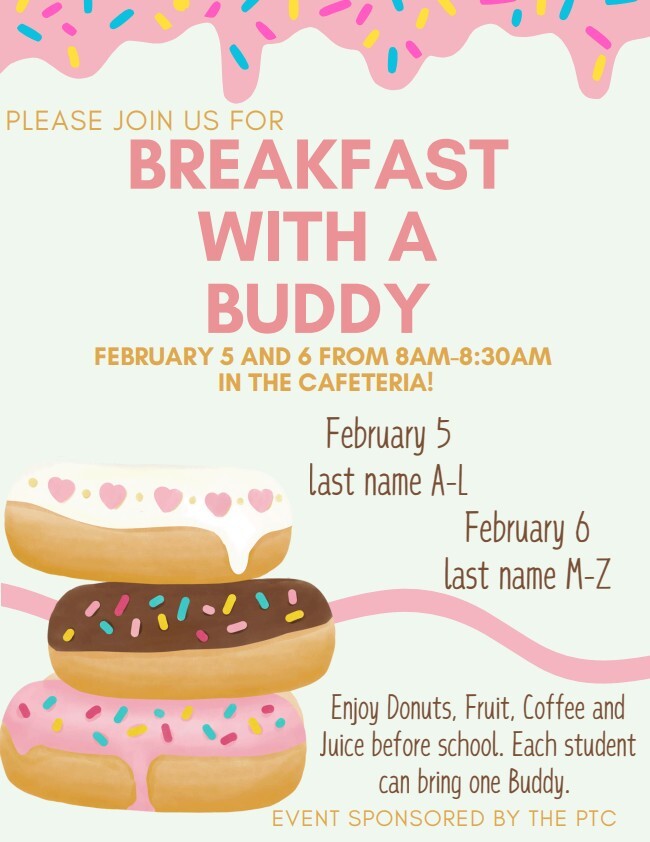 It is that time again for our Annual Breakfast with a Buddy Event, hosted by our PTC! This year the event is on February 5th and February 6th in the cafeteria. Students can bring in one Buddy before school for a quick breakfast treat of donuts, fruit, coffee and juice.