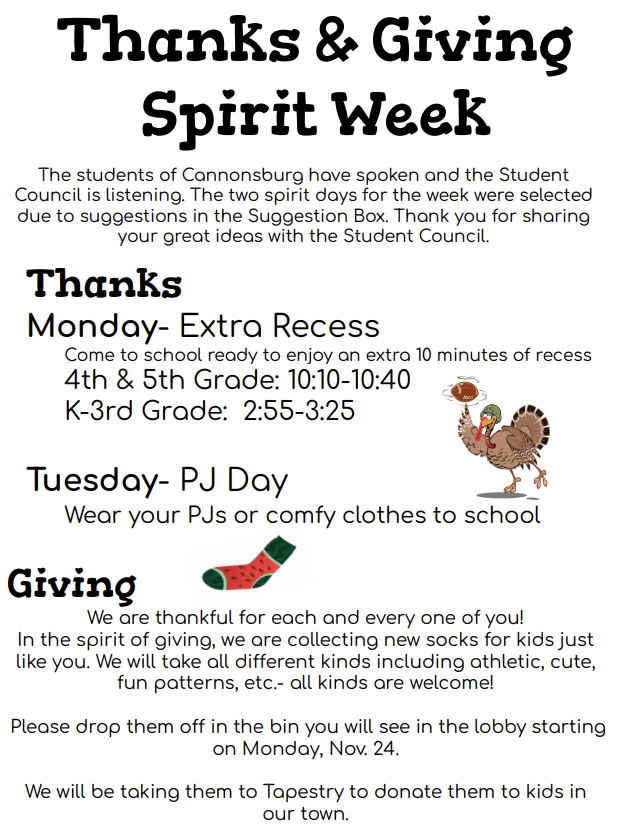 The students of Cannonsburg have spoke and the Student Council is listening. The two spirit days for the weeks were selected due to suggestions in the Suggestion Box. Thank you for sharing your great ideas with the Student Council