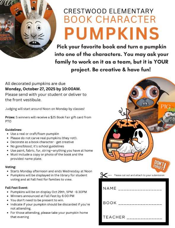 Get ready for some spooktacular fun at Crestwood! It's an event for the whole family on October 29th from 5PM - 6:30 PM. PTO will have food trucks, a Trick-or-Treating trail with staff dressed up, family activities and more! Student's look forward to this event every year and we encourage costumes for Halloween!