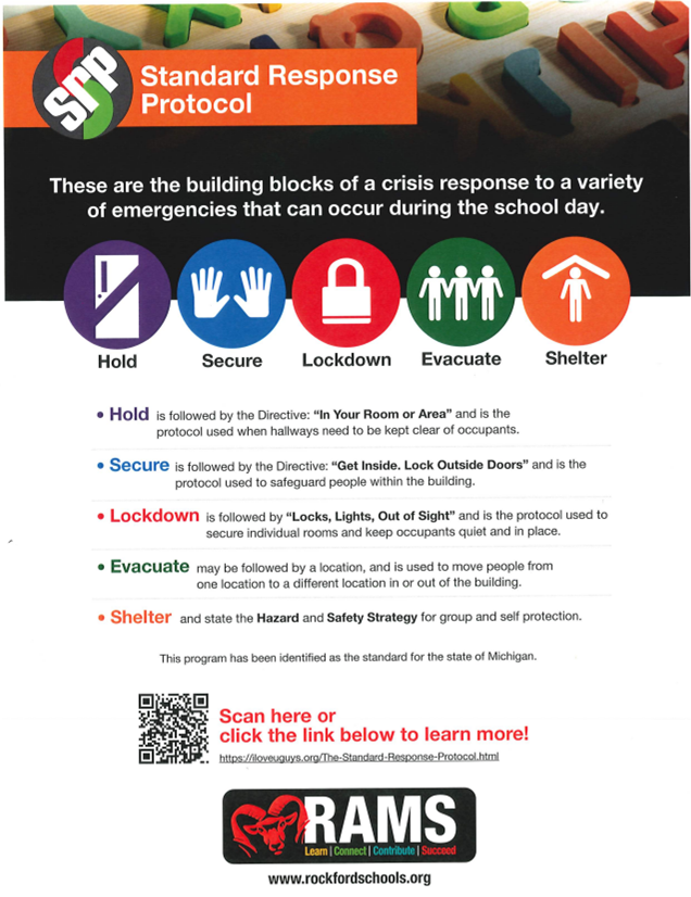 This year Rockford Public Schools is following the Standard Response Protocol (SRP) developed by the “I Love U Guys” Foundation. The SRP provides clear, common language for how we, as staff and students, respond to different situations, whether that’s a drill, a medical emergency, or a security concern. The terms Hold, Secure, Lockdown, Evacuate, and Shelter are simple and action-based, helping everyone know exactly what to do. By practicing these responses, we ensure that our students and staff are prepared and safe in any situation.