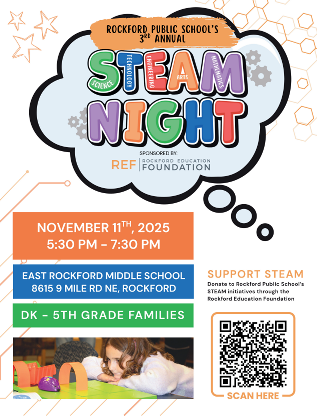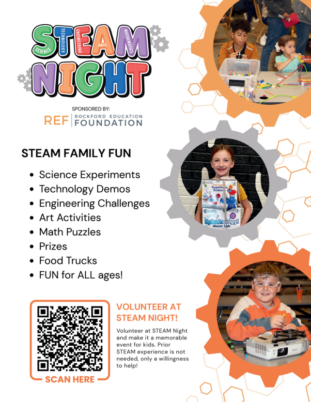Mark your calendars! Our annual STEAM Night is coming up on Tuesday, November 11th from 5:30–7:30 PM at East Rockford Middle School. Please note the important updates: the date has changed from November 4th to November 11th (due to voting day), and the location has moved from the Freshman Center to East Rockford Middle School. More details can be found on the attached flyer.