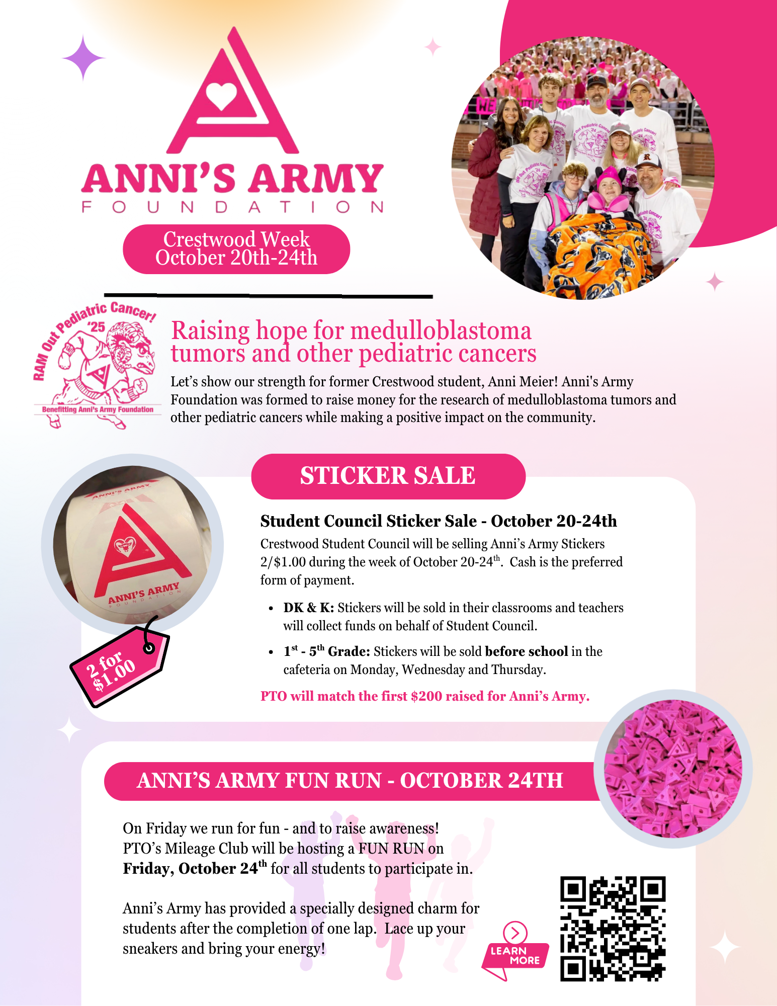 Let’s show our strength for former Crestwood student, Anni Meier! Crestwood Student Council will be selling Anni’s Army stickers the week of October 20-24th. Cash is the preferred form of payment. PTO will match the first $200 raised for Anni’s Army.