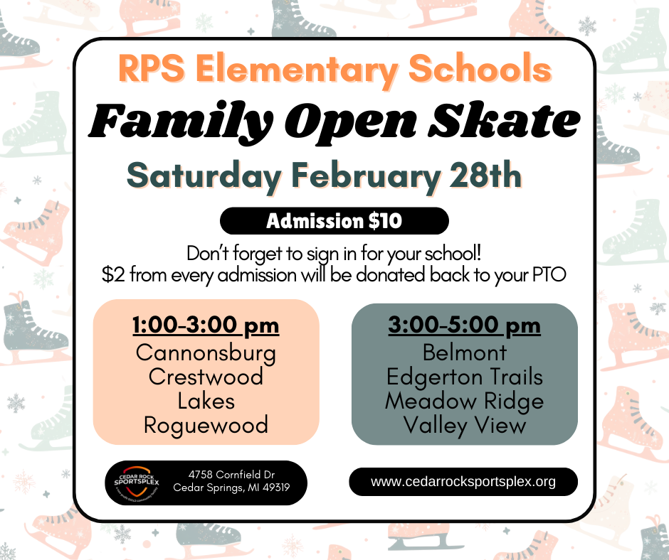 Crestwood's time is 1PM to 3PM on February 28th at Cedar Rock Sportsplex. Purchase tickets at the door for $10 each which include two hours of open skating time and ice skate rentals. PTO receives $2 back in donations from each ticket sold during their school time slot.