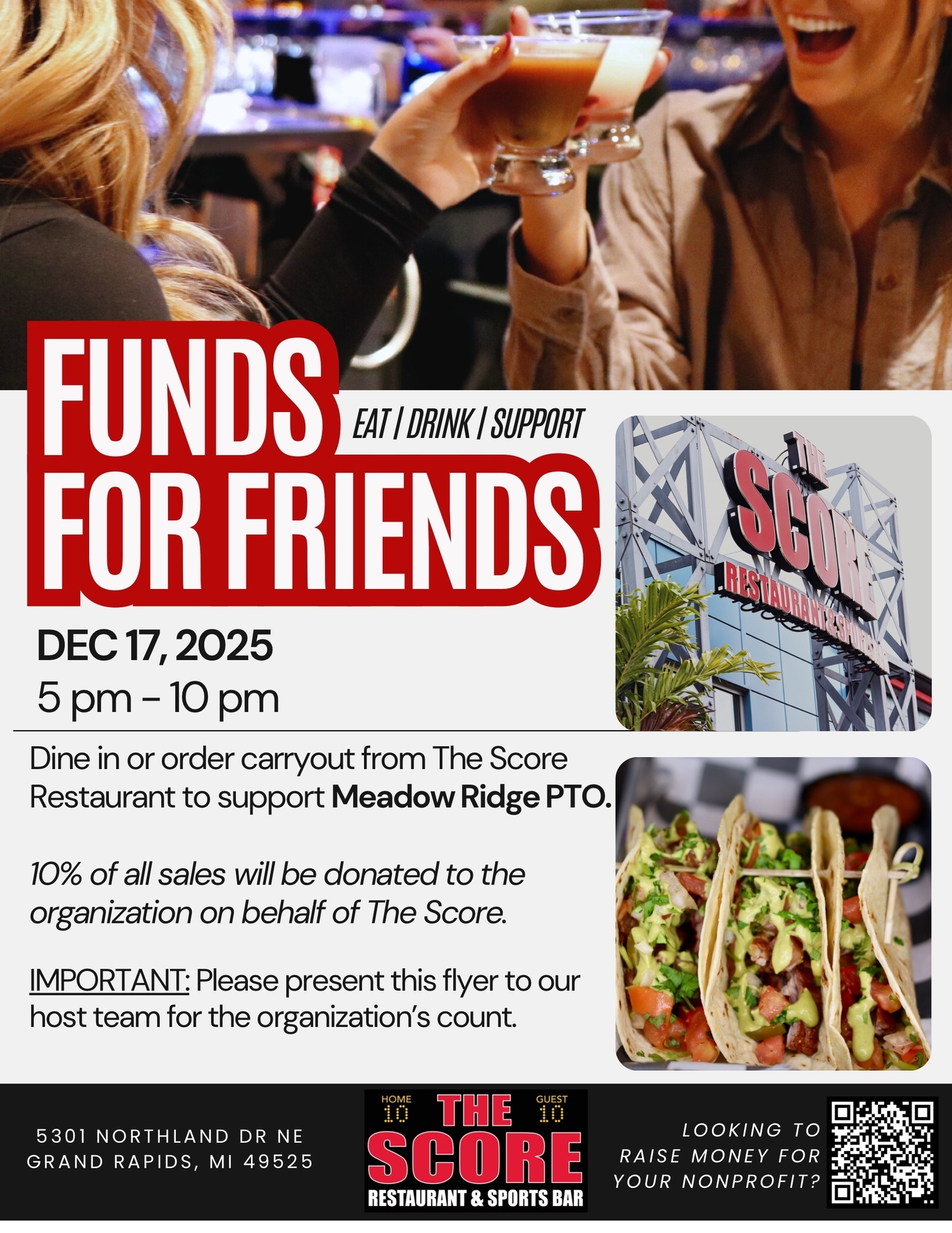 Meadow Ridge, we’d love to see your faces at The Score on December 17th for Funds For Friends! Plan your dinner that night (dine in OR take out!) and Meadow Ridge PTO will receive 10% back of all sales to put right back into our school! This is a great time to see friends out & dinner planned, with the busy season. Mark your calendars!