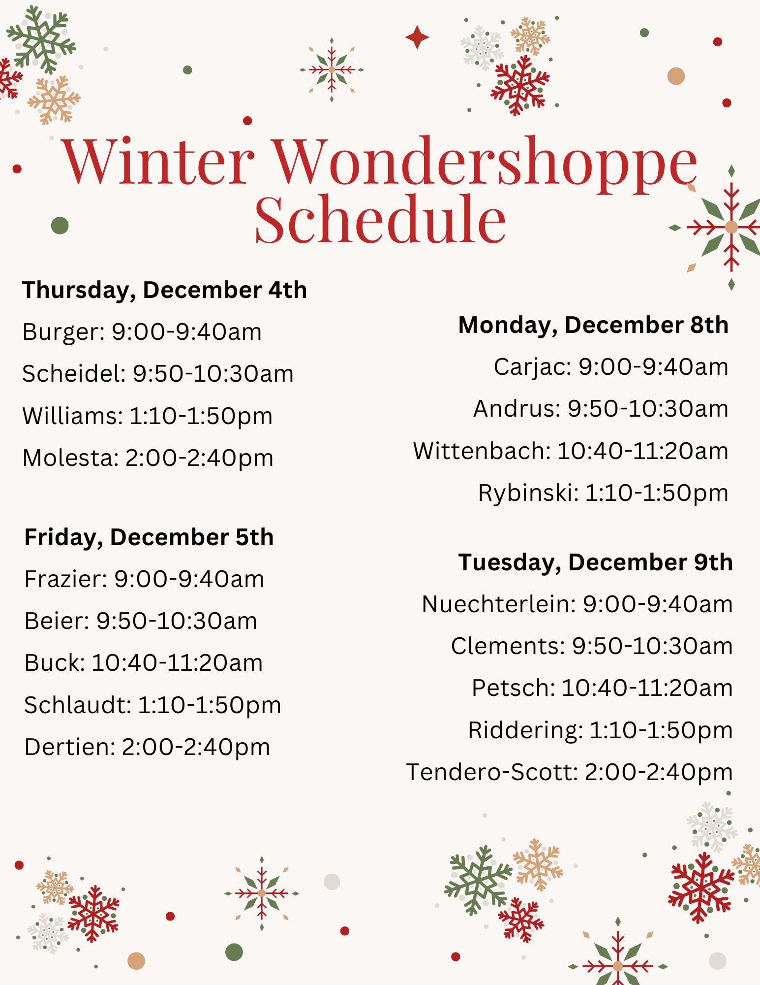 - Tuesday, December 9th: Winter Wondershoppe Family Night - 4-7pm