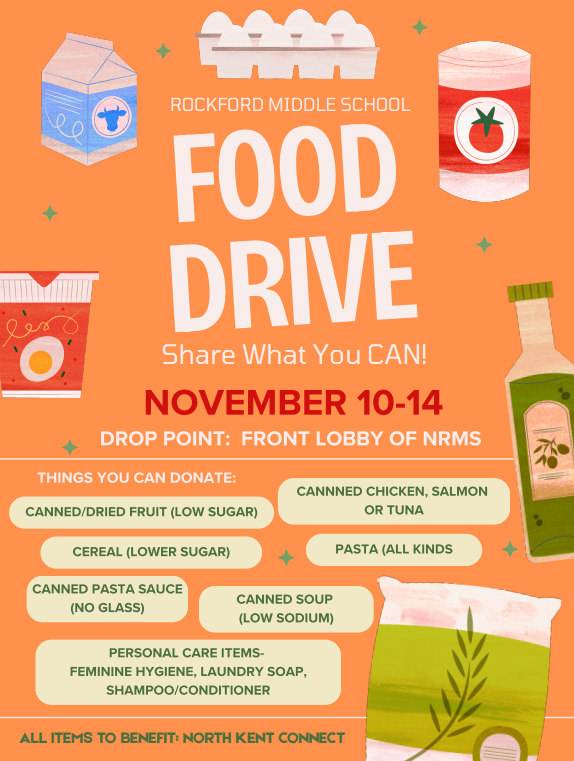 We will be collecting non-perishable food items to support North Kent Connect and help stock their pantry for the winter months. Students can bring donations to the main lobby collection table each morning next week. Our school-wide goal is 900 items — let’s see if North can reach (or even surpass!) that number to help families right here in Kent County.