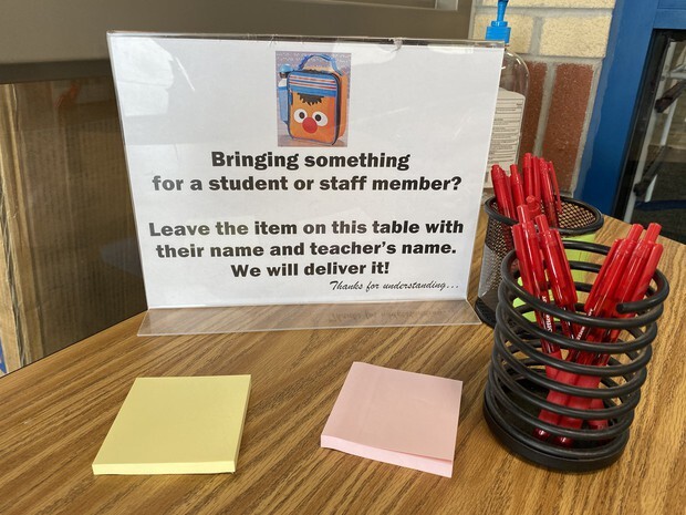 If you have an item that needs to get to a student, simply drop it off on our bookcase in our vestibule and provide the student’s name and classroom on a Post-It note. We will make sure it gets where it needs to go.