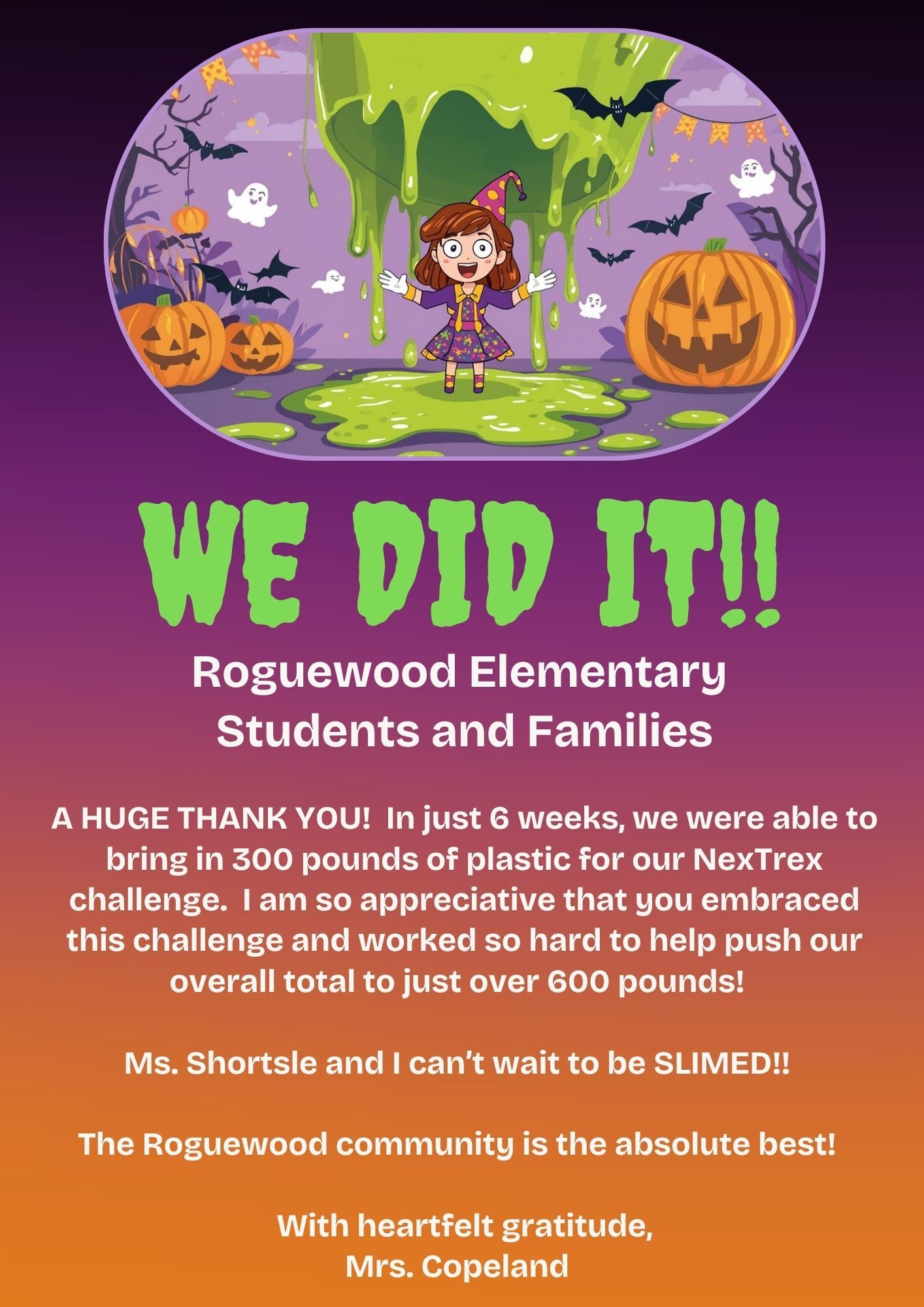 We did it!! We are beyond grateful to all the students (families) and staff that helped collect plastic. In just 6 weeks we collected just over 300 pounds. Way to go Roguewood!