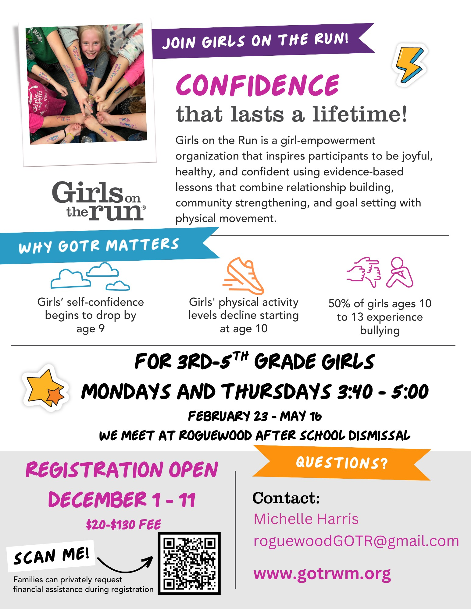Join Girls on the Run and discover just how strong, confident, and capable you truly are! Registration is open December 1 - 11 — you don’t want to miss it! See flyer attachedor visit www.gotrwm.org for registration info.