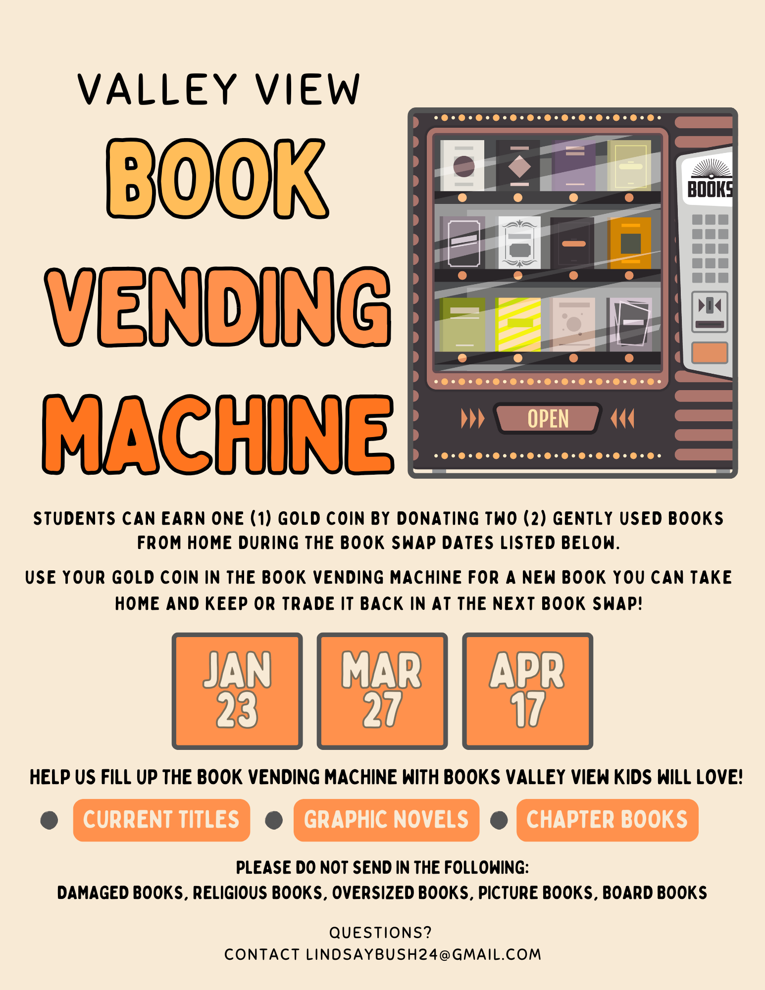 Our next three book vending machine dates are January 23, March 27, and April 17. Students can earn one gold coin by donating two gently used books from home during the swap dates. Use your gold coin in the book vending machine for a new book you can take home and keep or trade it back in at the next book swap!