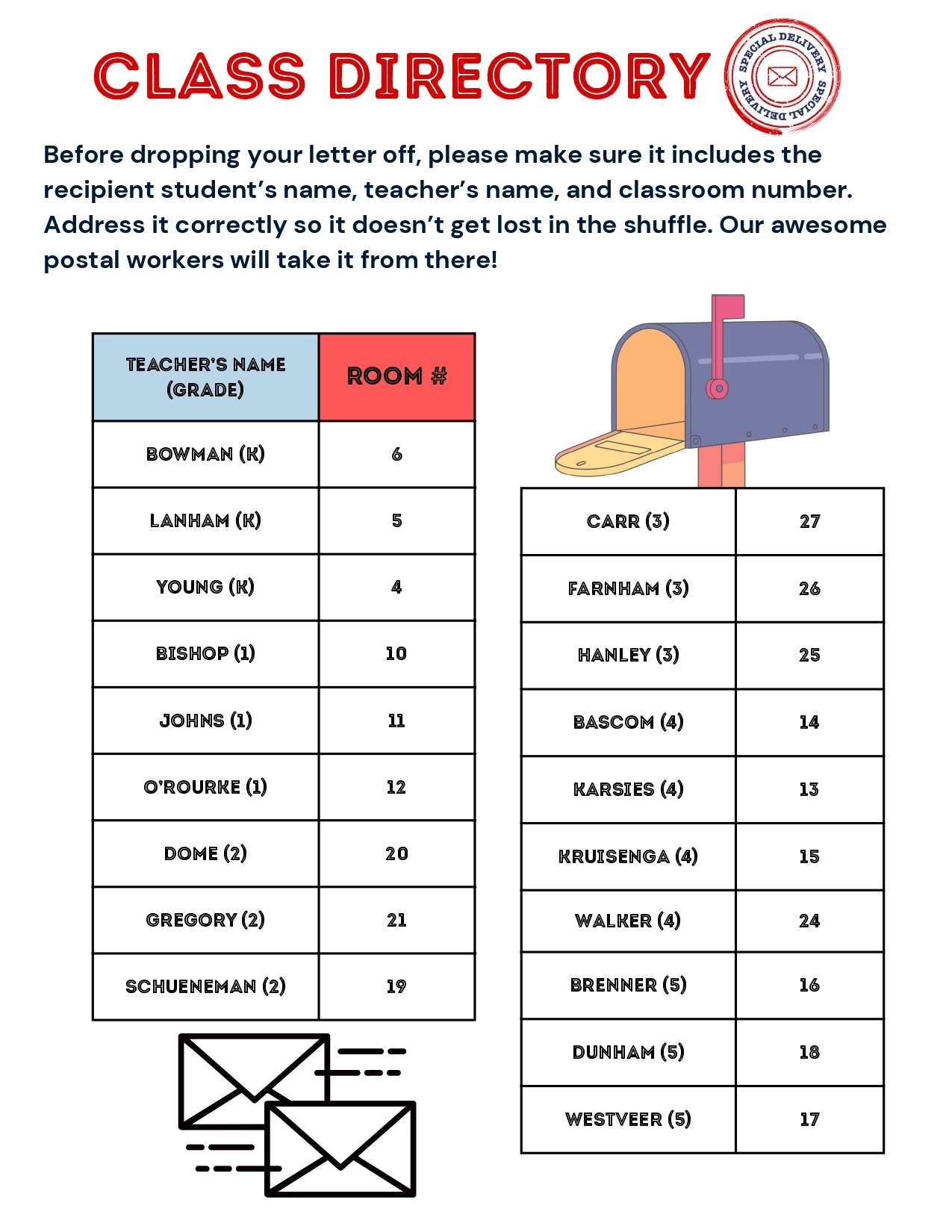 Image above reads: Class directory. Before dropping you letter off, please make sure it includes the recipient student's name, teacher's name, and classroom number. Address it correctly so it doesn't get lost in the shuffle. Our awesome postal workers will take it from there! Bowman room 6, Lanham room 5, Young room 4, Bishop room 10, Johns room 11, O'Rourke room 12, Dome room 20, Gregory room 21, Schueneman room 19, Carr room 27, Farnham room 26, Hanley room 25, Bascom room 14, Karsies room 13, Kruisenga room 15, Walker room 24, Brenner room 16, Dunham room 18, Westveer room 17.