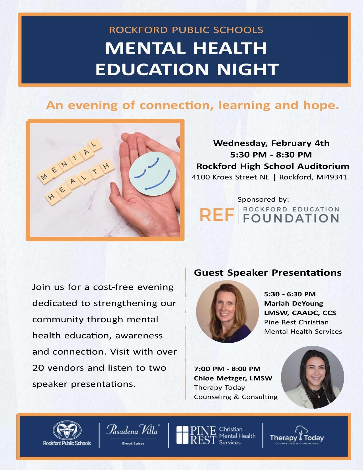 Join us for a cost-free evening dedicated to strengthening our community through mental health education, awareness, and connection. Visit with over 20 vendors and listen to two speaker presentations. Guest speakers are Mariah DeYoung, LMSW, CAADC, CCS and Chloe Metzger, LMSW. Wednesday, February 4th - 5:30 - 8:30pm at the Rockford High School Auditorium - 4100 Kroes Street, NE, Rockford, MI 49341