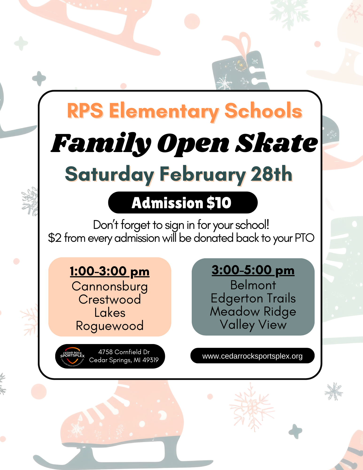 Join us for the RPS Elementary School family open skate on Saturday, February 28th from 3-5pm at the Cedar Rock Sports Plex. Admission fee is $10 and if you sign in for Valley View, our PTO receives $2. We hope to see you there!