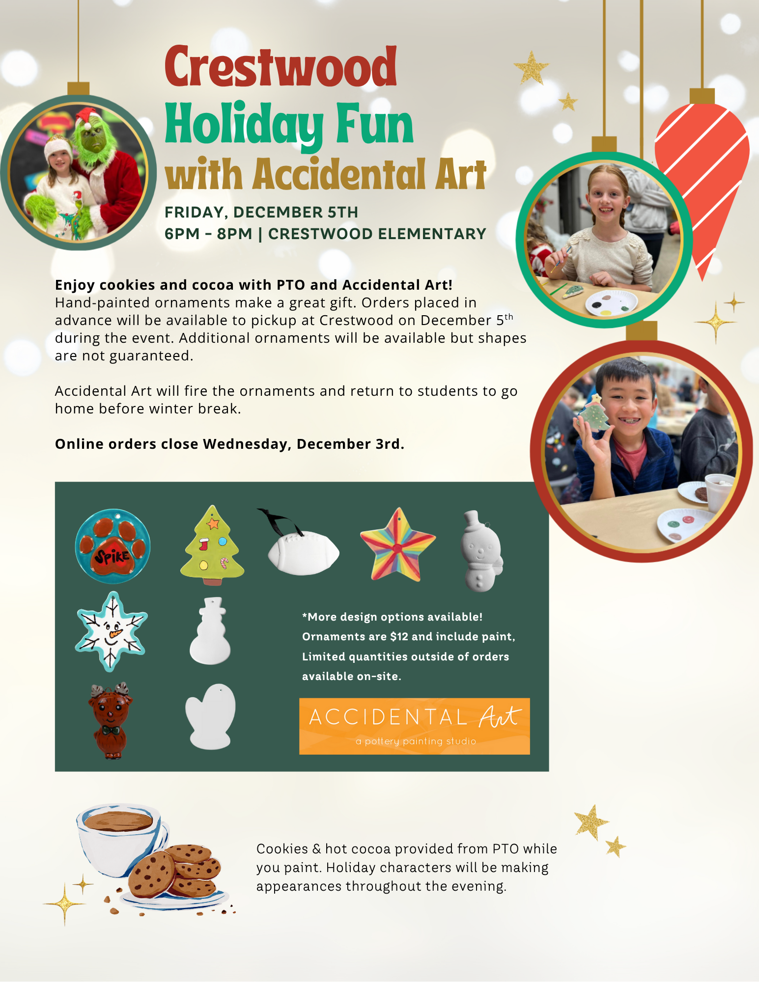 Hand-painted ornaments make a great gift! Enjoy cookies, cocoa and ornament painting with Accidental Art on Friday, December 5th! Place an order in advance or purchase ornaments onsite to paint (limited inventory available onsite). Accidental Art will fire the ornaments and return to students to go home before winter break. Cookies, cocoa and holiday guest appearances provided by PTO.