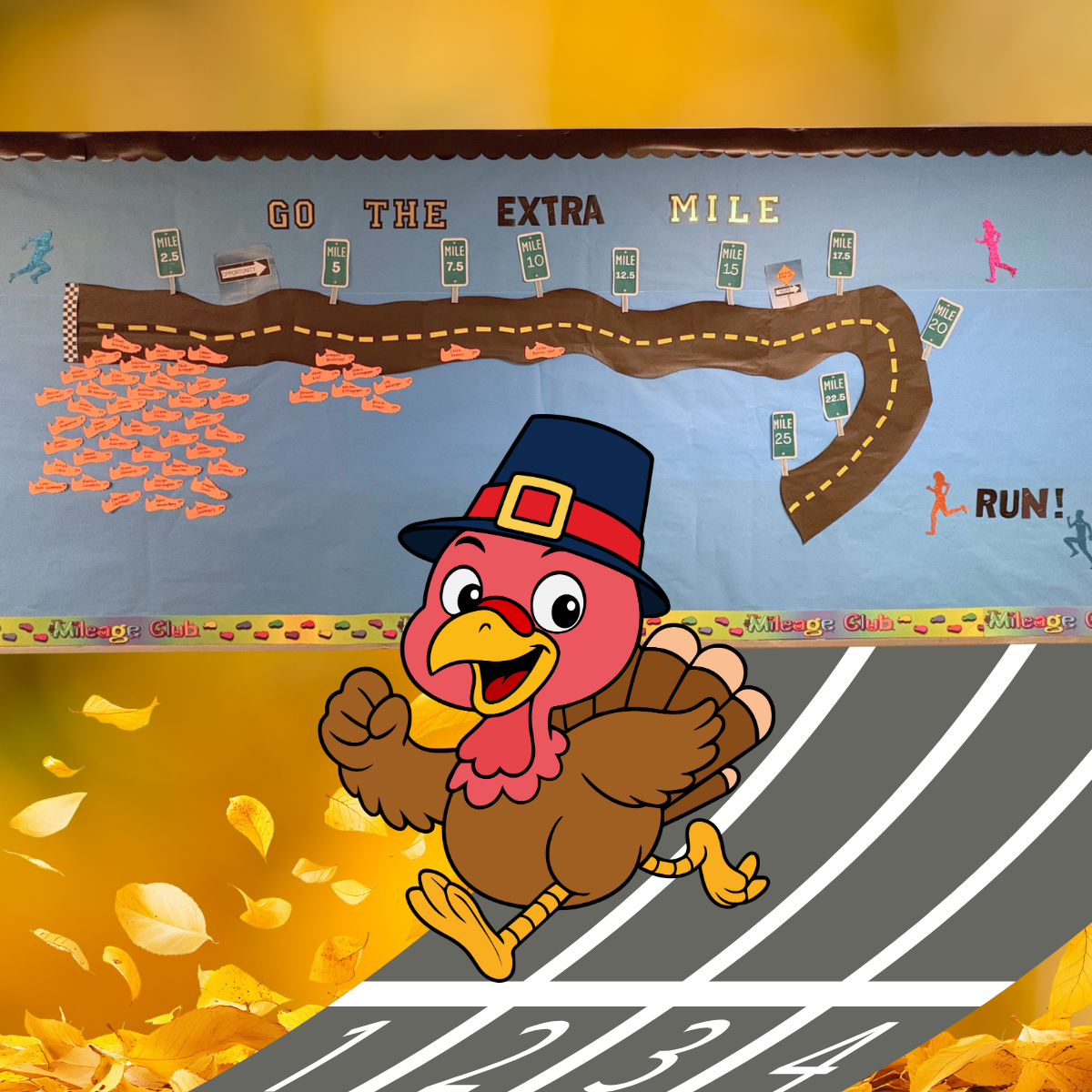 Mileage club will end for 2025 on November 21st with a Turkey Fun Run! We will be back up and running in the Spring of 2026! Students can track their progress on the bulletin at school outside the office.