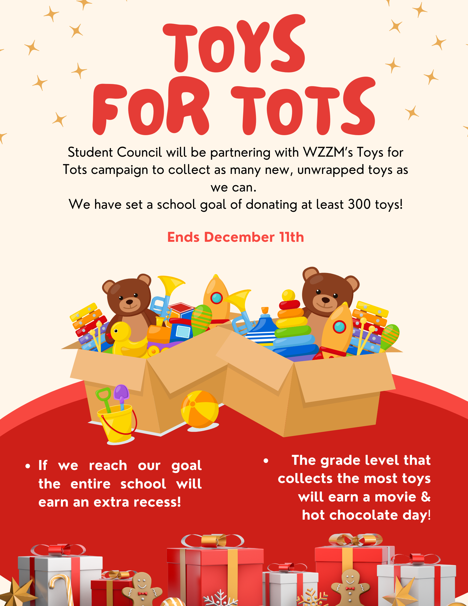 Student Council will be partnering with WZZM’s Toys for Tots campaign to collect as many new, unwrapped toys as we can.